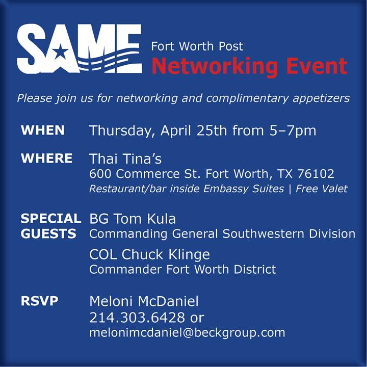 April 25th 5-7pm Networking Event with BG Tom Kula! By Meloni McDaniel on April 5, 2013 • ( 0 ) Share this: Click to share on X (Opens in new window) X Click to share on Facebook (Opens in new window) Facebook Click to share on LinkedIn (Opens in new window) LinkedIn Click to print (Opens in new window) Print Click to email a link to a friend (Opens in new window) Email Like Loading...‹ April Sustaining Member FirmsApril 25th USACE’s 6th Annual SDVOSB Networking Forum ›Categories: Uncategorized