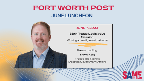 | Please join us for the Fort Worth Post June 7 Meeting REGISTER HERE Topic: “Recapping the 88th Texas Legislative Session: What you really need to know.” Speaker: Travis Kelly is a Freese and Nichols Account Director/Government Affairs and has spent more than 13 years helping clients navigate local, state and federal legislative and regulatory processes. He spent 10 years in leadership roles supporting Texas’ Dallas-Houston high-speed rail project. He worked with lobbyists in Washington, DC and in Austin during multiple sessions of the Texas Legislature. He also managed social and traditional media relations for the project, including serving as a spokesperson for print, radio and TV. His broad experience includes managing key elements of multifaceted infrastructure projects, analyzing legislative impacts on public projects, understanding funding streams and engaging with stakeholders, including elected officials, local, state and federal agencies and international partners. He has worked extensively on public engagement with diverse communities to build consensus on critical projects. A native Texan and graduate of Baylor University, Travis lives with his wife and their 10-month old son in Argyle. _______________________ TIME: 10:30 a.m. Board Meeting 11:30 a.m. Registration 12:30 p.m. Lunch and Program LOCATION: “777 Main” Petroleum Club | 40th Floor 777 Main Street | Fort Worth, Texas COST: $35.00 Full Buffet $30.00 Young Members PARKING: $6.15 On-Site Parking (with validation) ________________________ 2023 Sustaining Member Presentations Sign up to give your Company Elevator Pitch at this meeting! With the intent of making it easier on sustaining members to coordinate the month/ date they will be able to give their annual company elevator pitch, the SAME Ft Worth Chapter will open up a new Eventbrite sign up page located on the Chapter webpage. The number of speaking firms per month will be limited to 5 so once “tickets” are sold out firms will need to choose another open month. Register to present your company at this meeting HERE Bonus: As a new feature, speaking firms will have the option to purchase a $50 donation raffle gift card in advance through Eventbrite rather than bringing their own as has been the tradition. The Ft. Worth Post will have the gift cards ready for that event when the speaker arrives. Of course if you’d like to bring your own gift card, that is still ok too! |