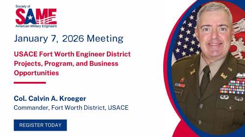 Join us as we start 2026 with the USACE Fort Worth Commander COL Calvin Kroeger, who will provide an update on the District’s Projects, Program, and Business Opportunities at the Fort Worth Petroleum Club, 777 Main Street, 40th Floor, Fort Worth, TX. Buffet Lunch and Social 11:30-12:00, Program 12:00-13:00.