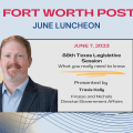 Please join us for the Fort Worth Post June 7 Meeting REGISTER HERE Topic: “Recapping the 88th Texas Legislative Session: What you really need to know.” Speaker: Travis Kelly is a Freese and Nichols Account Director/Government Affairs and has spent more… Read More ›